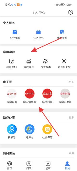 2、進入個人中心頁面使用積分商城、任務(wù)中心等個人服務(wù),利用聯(lián)系我們、清除緩存等常用功能,還可查看海南日報、南國都市報等電子報,獲取本地資訊。