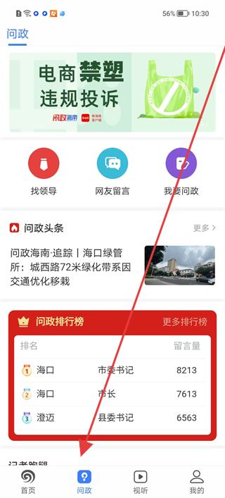 1、進入軟件問政頁面,瀏覽電商禁塑違規(guī)投訴等問政內(nèi)容,查看問政頭條、問政排行榜,了解海南各地的問政動態(tài)與留言量情況。