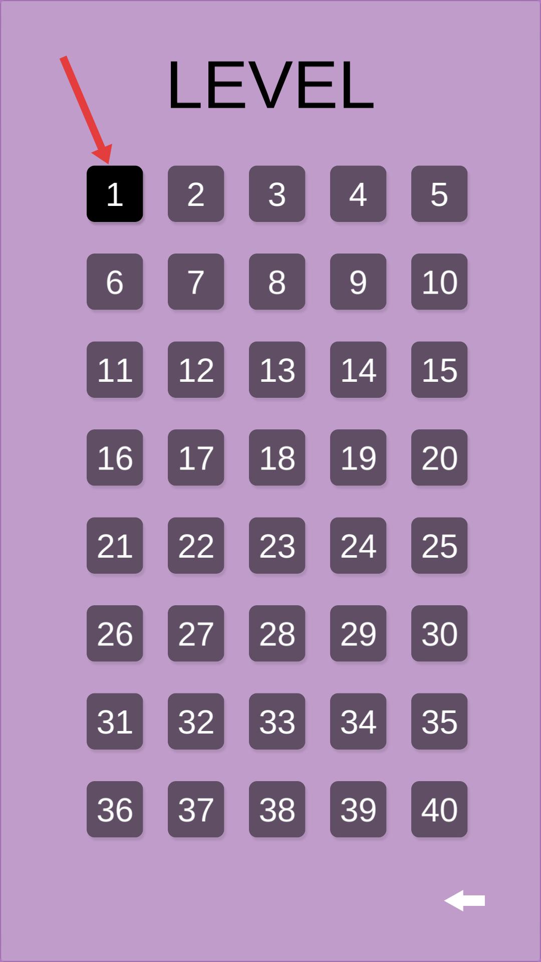 2、進(jìn)入關(guān)卡選擇界面,有多個關(guān)卡可選,選擇標(biāo)有1的黑色方塊關(guān)卡,進(jìn)入第一關(guān)游戲場景,開始挑戰(zhàn)。