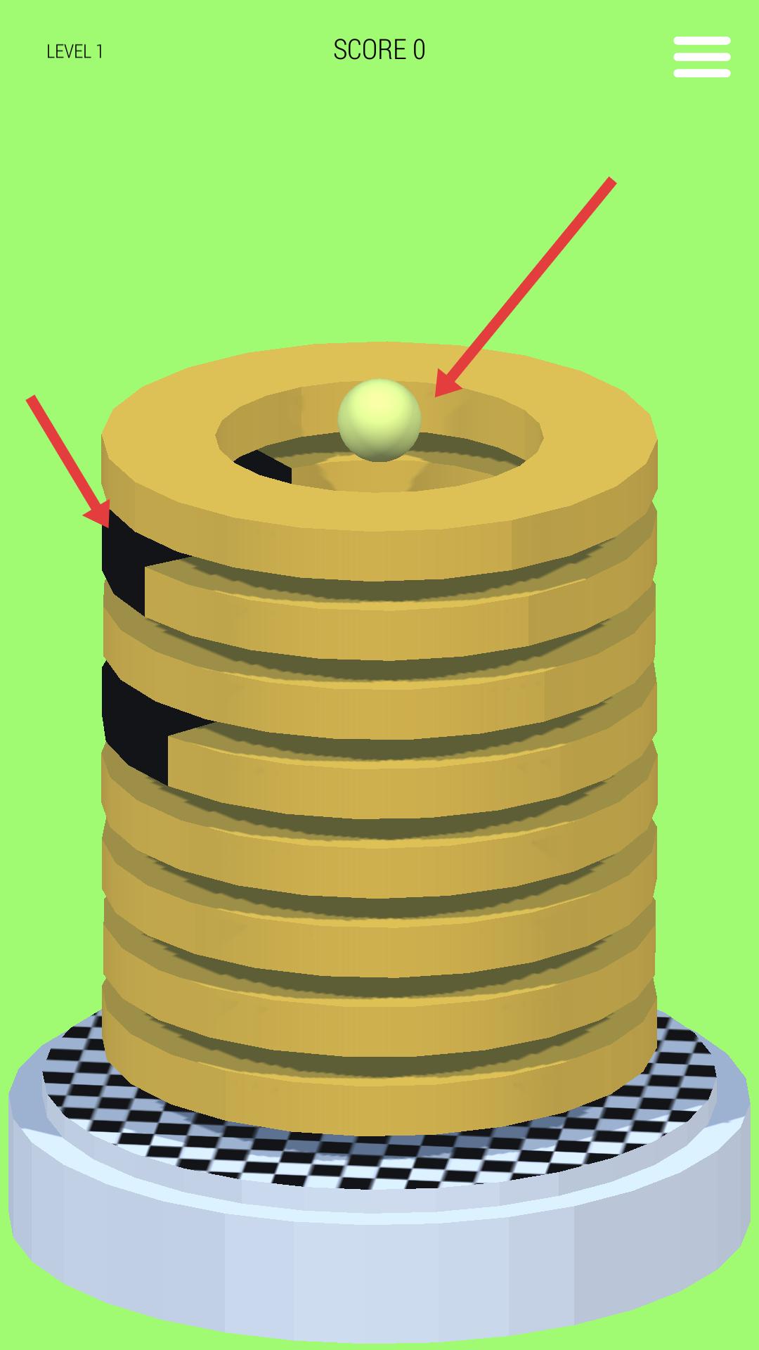 3、第一關(guān)游戲觀察塔狀結(jié)構(gòu),控制小球下落,避開黑色障礙物,讓小球順利通過各層,爭取獲得高分。