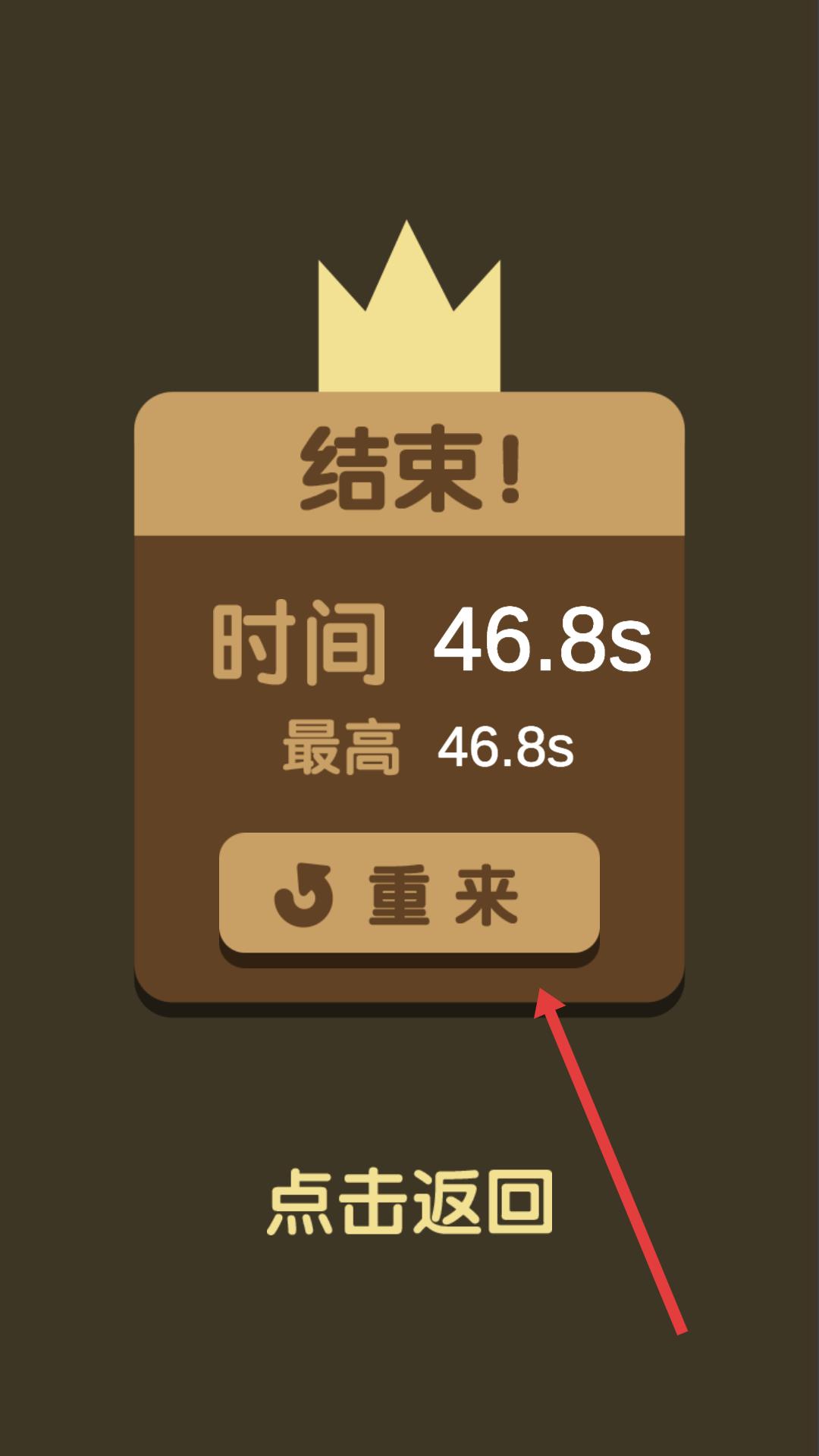 4、游戲結束界面顯示用時和最高分,若想再次挑戰(zhàn),點擊重來按鈕,繼續(xù)保護大腦,爭取更好成績。