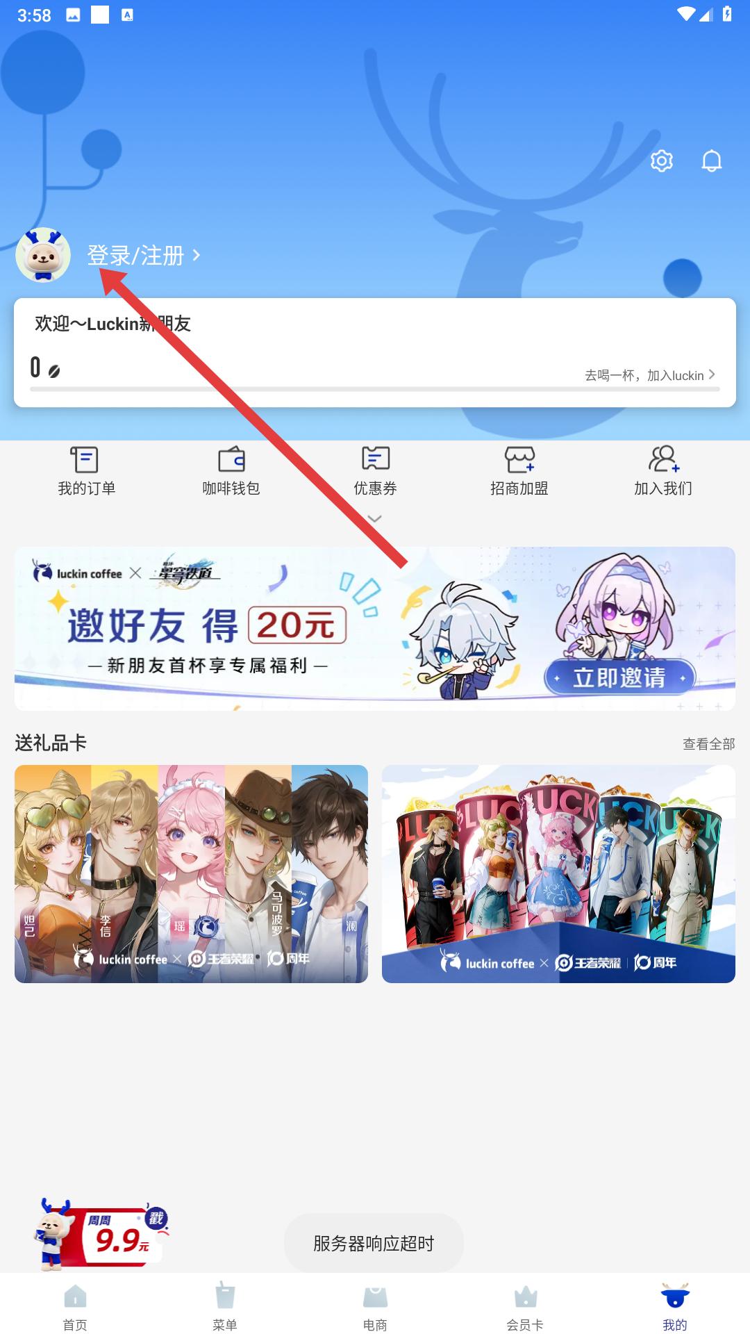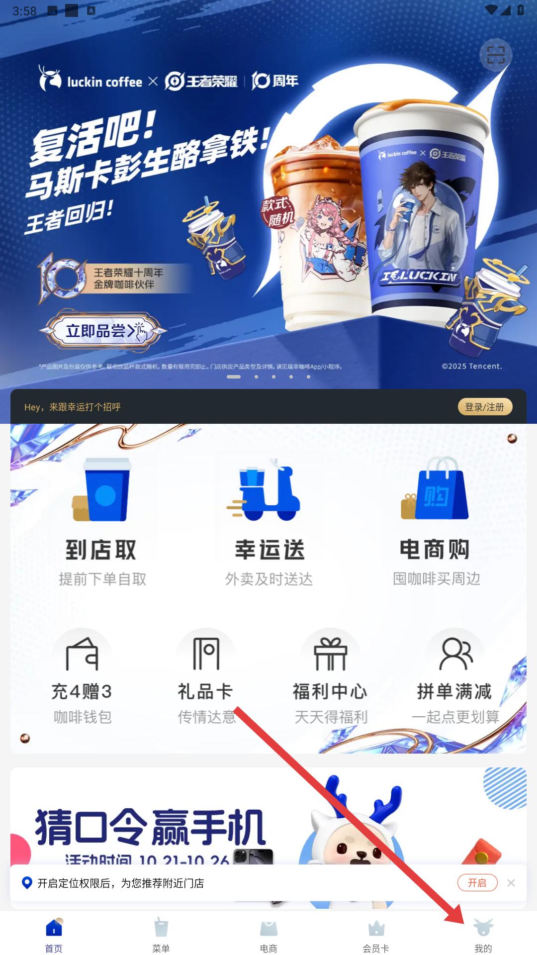 1、進入瑞幸咖啡APP首頁,可看到瑞幸與王者榮耀聯(lián)名活動展示,還有到店取、幸運送等功能入口,點擊底部我的可進入個人界面。