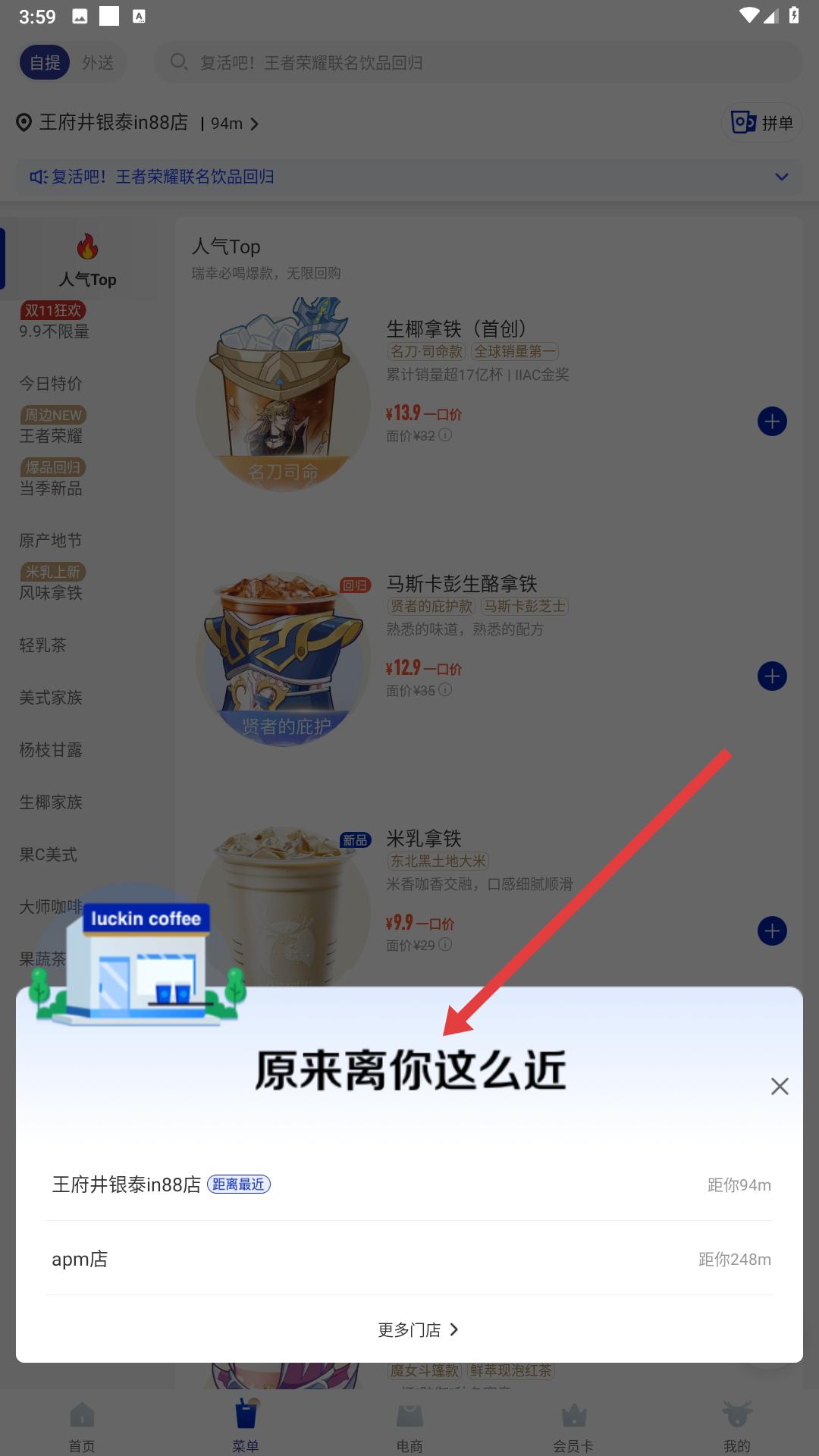 4、登錄后進入菜單界面,可看到附近門店推薦,如王府井銀泰in88店等,選擇門店后可查看該店飲品列表,如生椰拿鐵、馬斯卡彭生酪拿鐵等,方便下單購買。