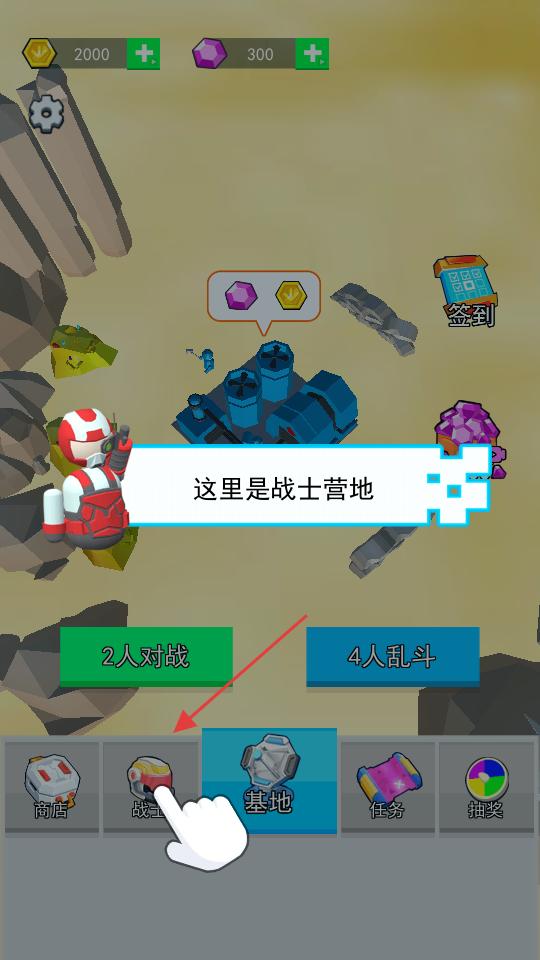 1、下載安裝完成后進(jìn)入,游戲初始頁,頁面提示點(diǎn)擊戰(zhàn)士營(yíng)地,進(jìn)入即可做站前準(zhǔn)備。