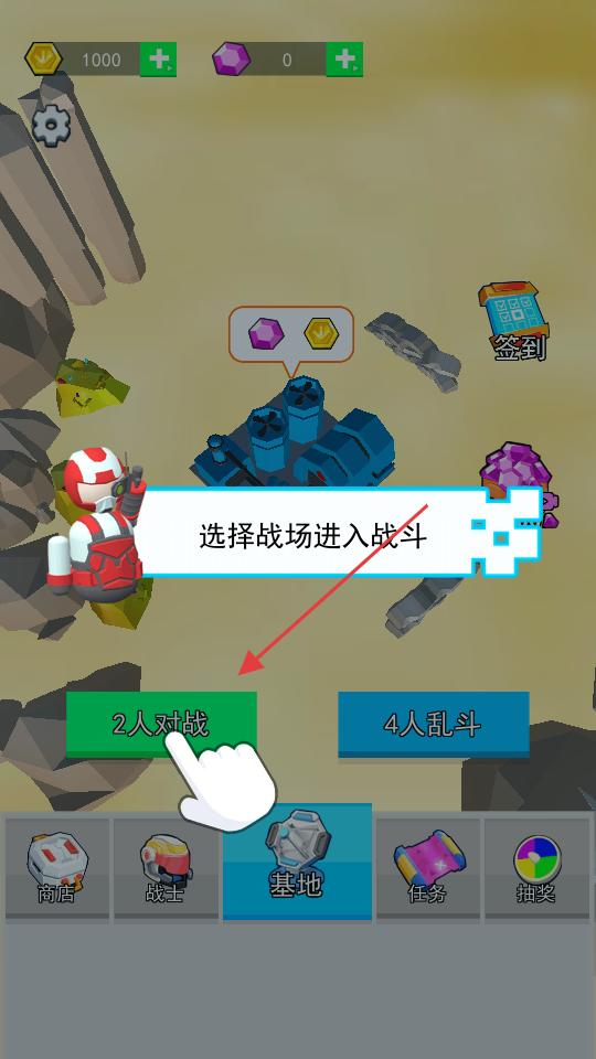 3、游戲場(chǎng)景提示,選擇戰(zhàn)場(chǎng)進(jìn)入戰(zhàn)斗,可選擇2人對(duì)戰(zhàn)或4亂斗模式進(jìn)入戰(zhàn)斗,點(diǎn)擊2人對(duì)戰(zhàn)進(jìn)入。