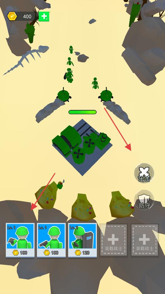 4、戰(zhàn)斗界面中有不同等級(jí)的戰(zhàn)士可供派出,具備出擊、防守功能按鈕,還有裝載戰(zhàn)士的位置,戰(zhàn)士部隊(duì)正在前進(jìn),畫面顯示剩余金幣。