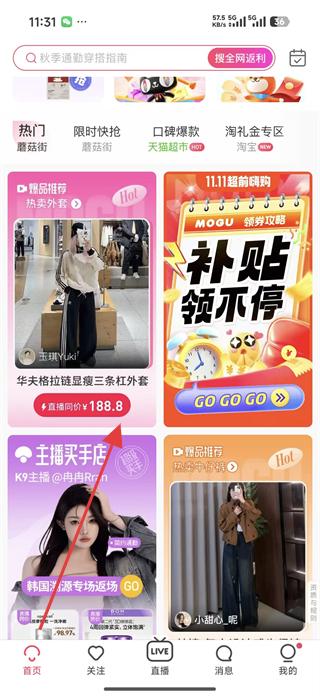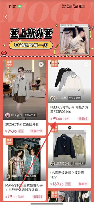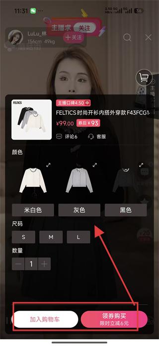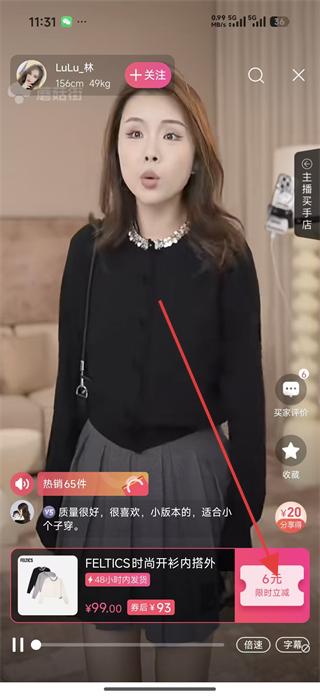 3、進(jìn)入直播頁面,可觀看主播推薦的商品,如FELTICS時(shí)尚開衫,還可關(guān)注心儀的主播,查看買家評價(jià),收藏商品。