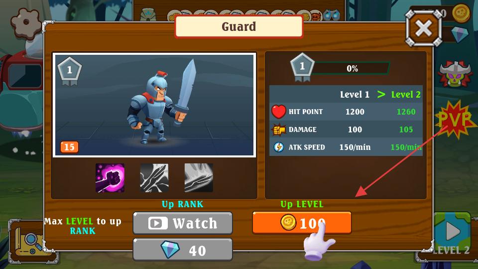 2、界面展示了守衛(wèi)的升級選項,等級1時,花費100金幣能進行升級,升級后生命值和傷害會有所增加。