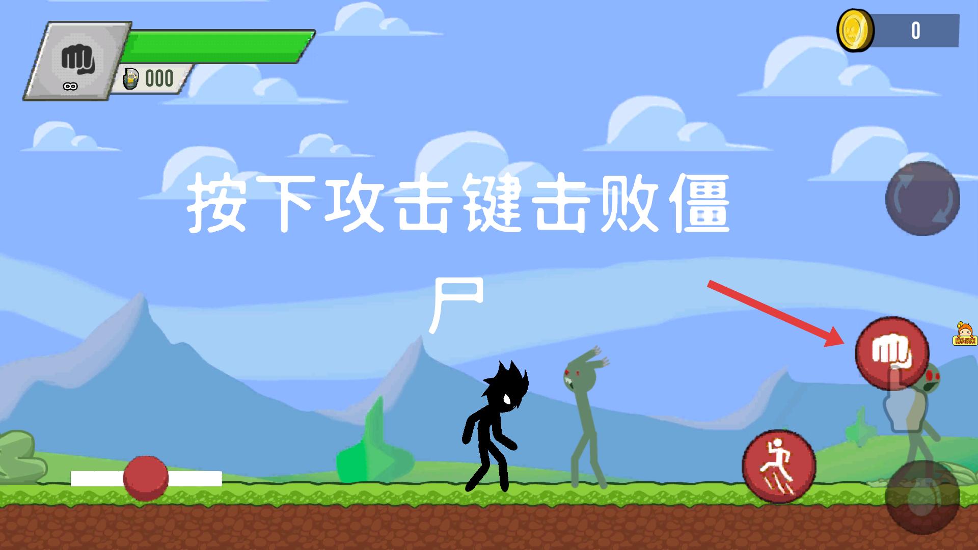 2、遇到僵尸點(diǎn)擊右側(cè)攻擊鍵,擊敗敵人,獲取金幣,注意把握攻擊時(shí)機(jī),提升戰(zhàn)斗效率。