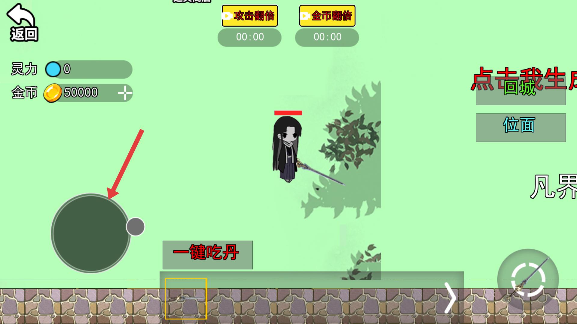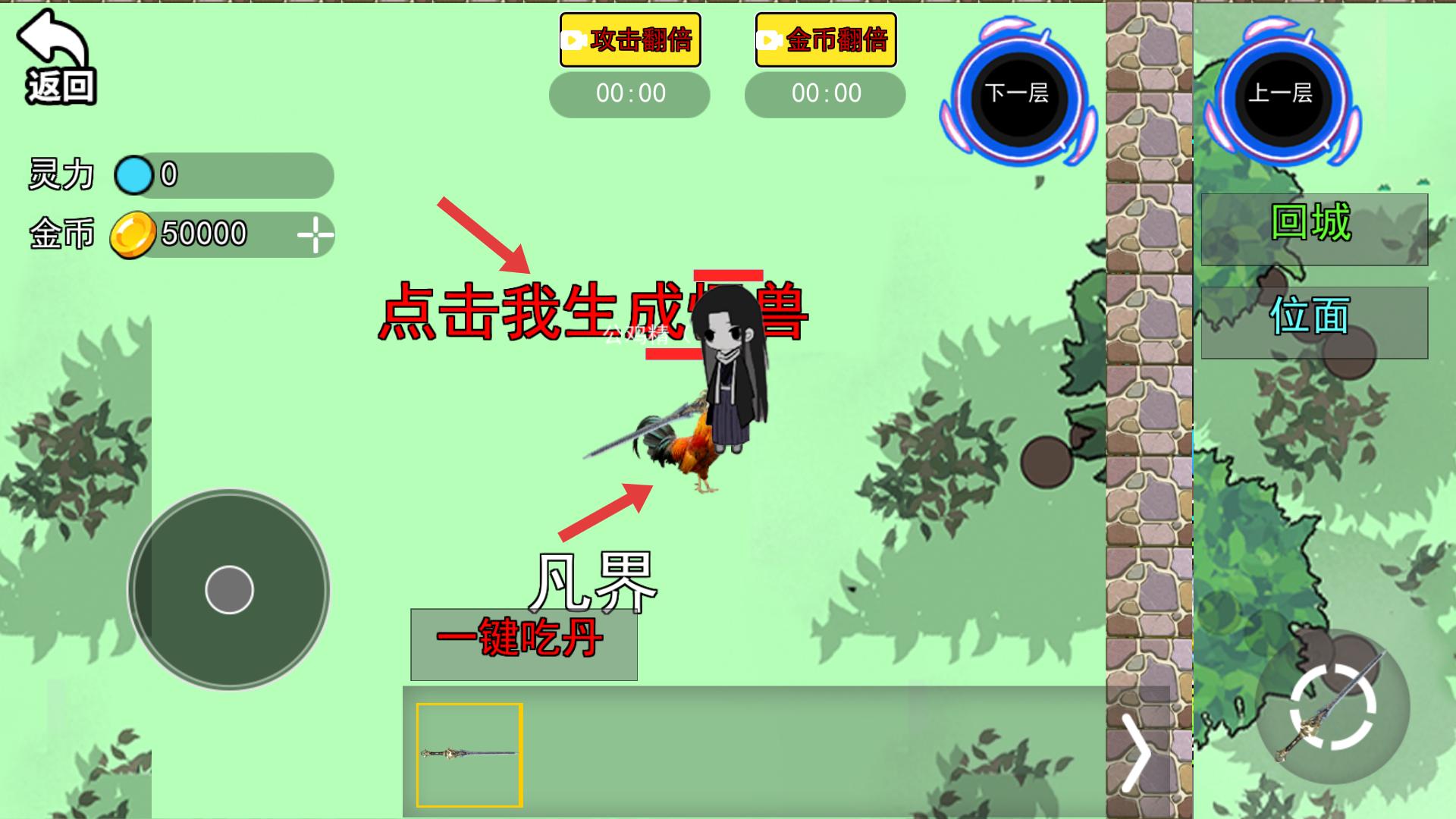 2、通過左側(cè)搖桿控制角色移動,探索場景,可點(diǎn)擊一鍵吃丹,利用資源提升屬性,應(yīng)對后續(xù)挑戰(zhàn)。