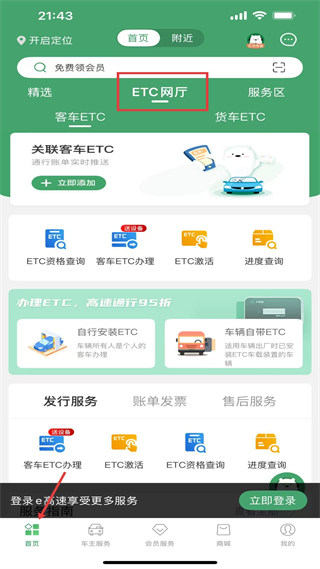 1、首頁ETC網(wǎng)廳,可關(guān)聯(lián)客車ETC,有ETC資格查詢、客車ETC辦理等功能入口,辦理ETC享高速通行95折,服務(wù)分類清晰。