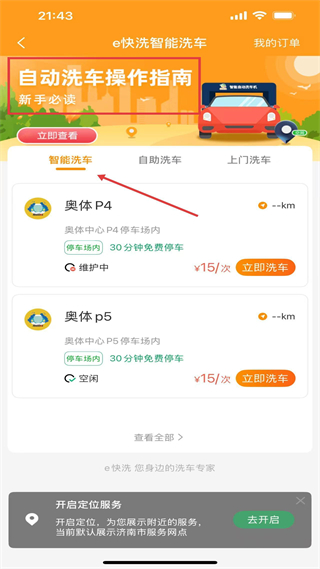 2、智能洗車頁有自動洗車操作指南,智能洗車含奧體P4、P5等網(wǎng)點,15元次,還可選擇自助洗車、上門洗車,功能實用。