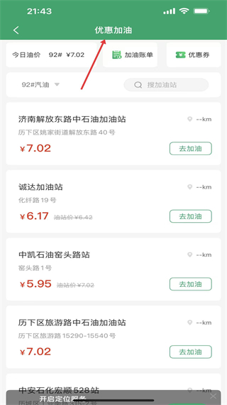 3、優(yōu)惠加油頁展示濟(jì)南多家加油站油價,92汽油價5.95-7.02元不等,可查加油賬單、領(lǐng)優(yōu)惠券,便于車主優(yōu)惠加油。
