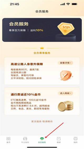 4、會員服務(wù)頁會員享高速公路人身意外保障、通行費返10金幣等服務(wù),金幣可換購商城商品,福利豐富。