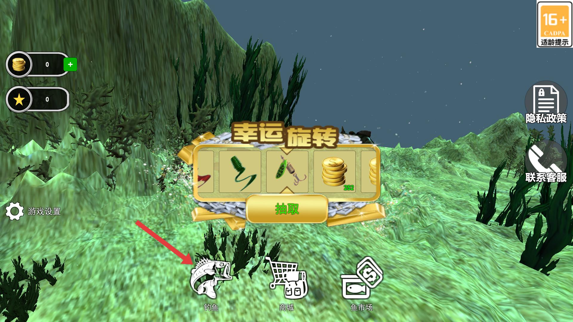1、點擊釣魚,進入釣魚場景,可先參與幸運旋轉抽取道具,為釣魚做好準備,開啟釣魚冒險。