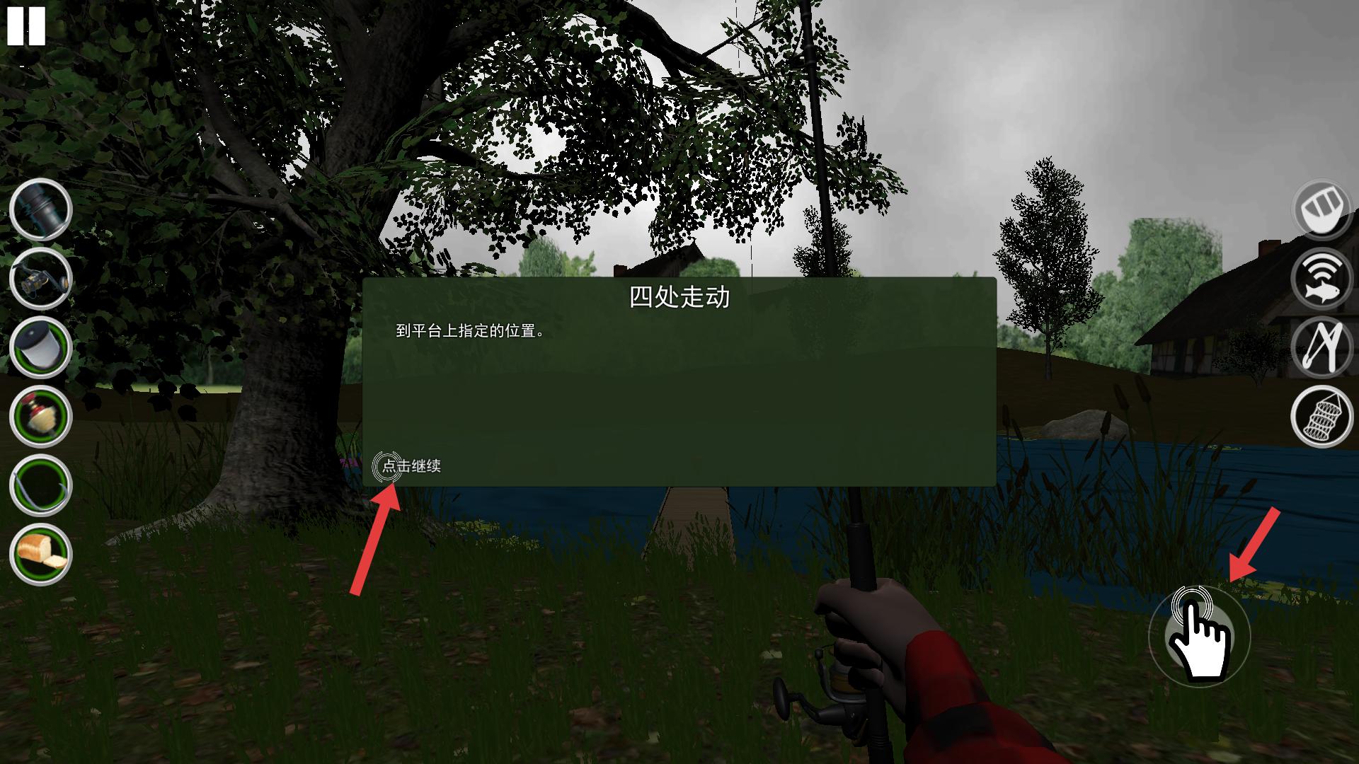 2、根據提示,四處走動,到達平臺上指定位置,準備開始釣魚,熟悉場景和操作,為后續(xù)拋線做準備。