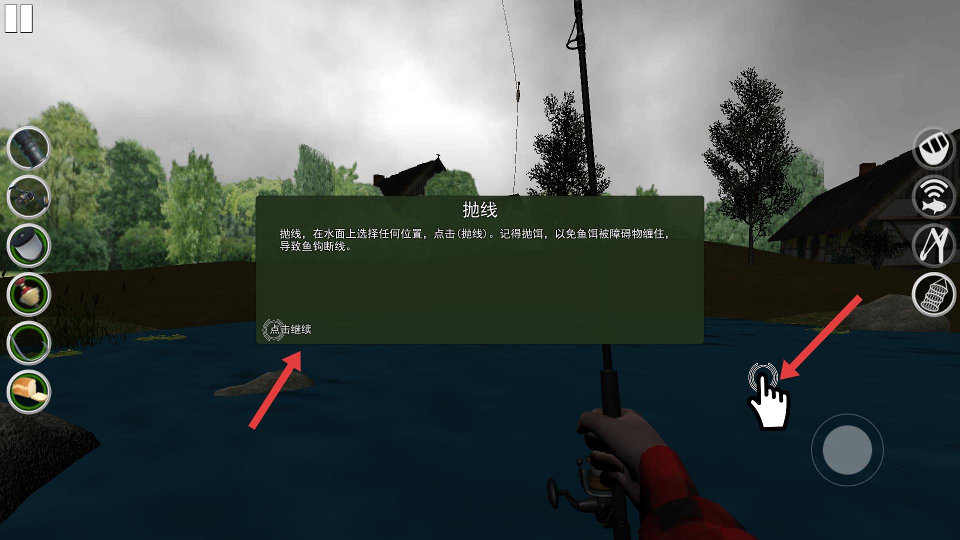 3、在水面選擇合適位置,點擊拋線,拋線時記得拋餌,避免魚餌被障礙物纏住,導致魚鉤斷線。