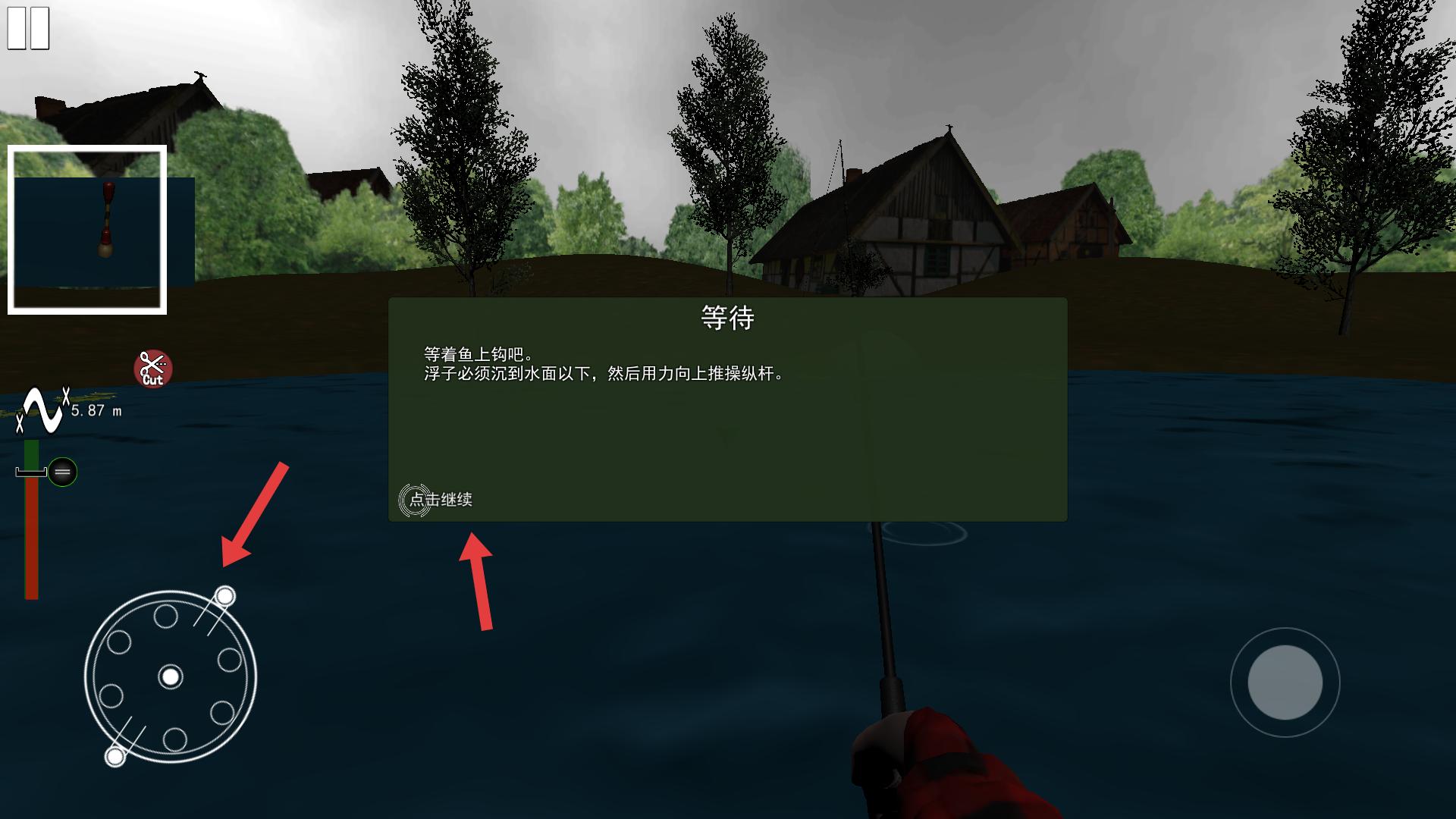 4、拋線后等待魚上鉤,當浮子沉到水面以下,用力向上推操縱桿,嘗試釣起魚,享受釣魚的樂趣。