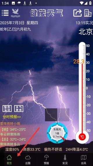 1、點(diǎn)擊首頁(yè),顯示北京天氣為雷陣雨轉(zhuǎn)小雨,有實(shí)時(shí)溫度、濕度及體感等信息。