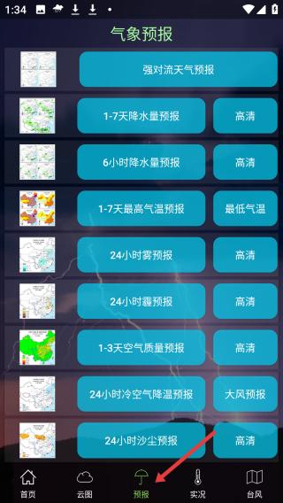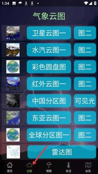 2、點(diǎn)擊云圖頁(yè)面,可查看衛(wèi)星云圖、水汽云圖等多種氣象云圖,助力天氣觀測(cè)。
