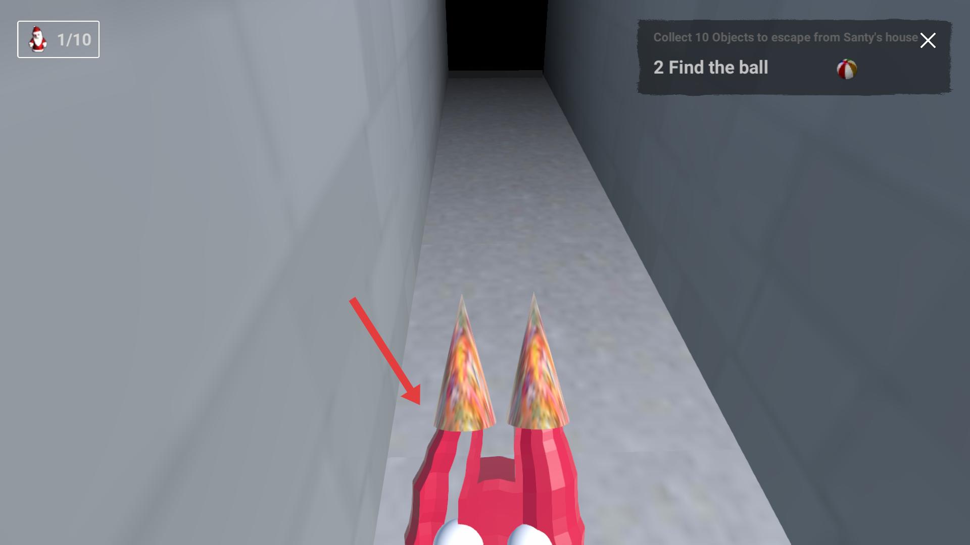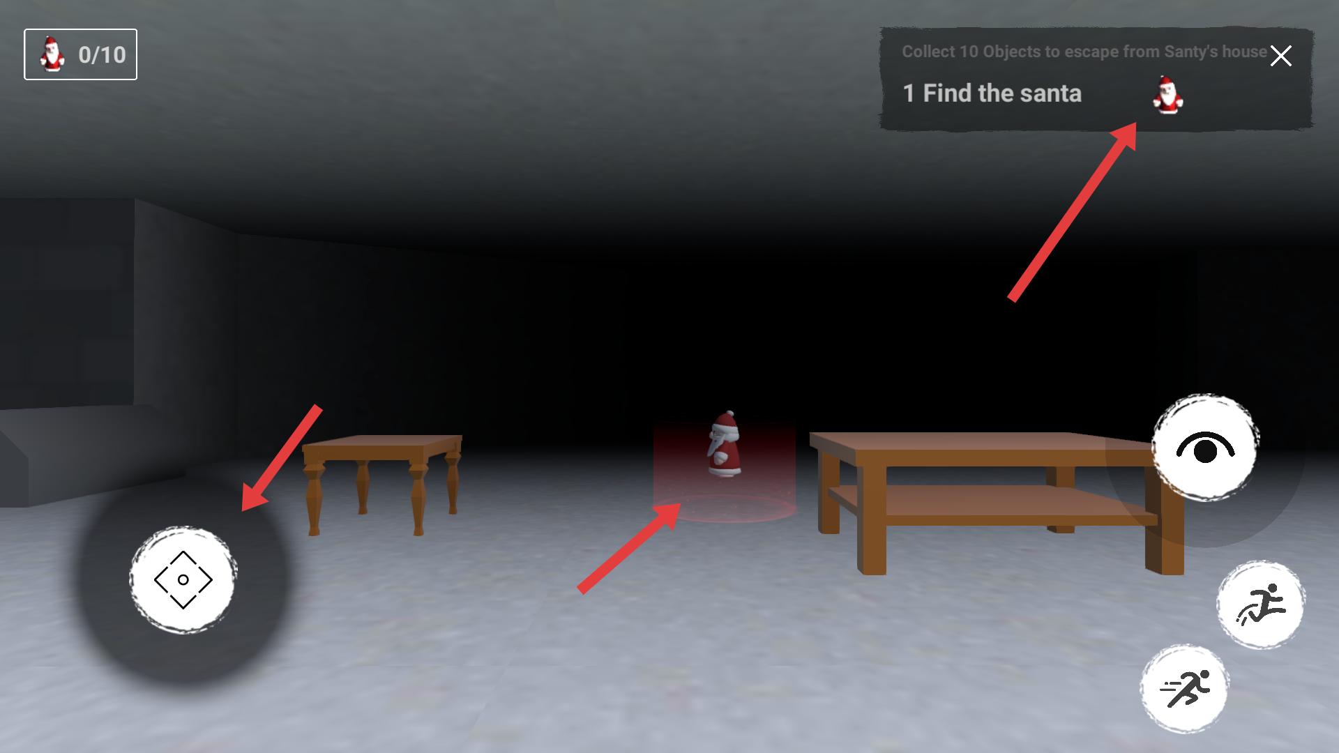2、進(jìn)入房間,用左側(cè)搖桿移動(dòng),按任務(wù)找圣誕老人,避開(kāi)障礙,靠近目標(biāo)完成收集,推進(jìn)進(jìn)度。