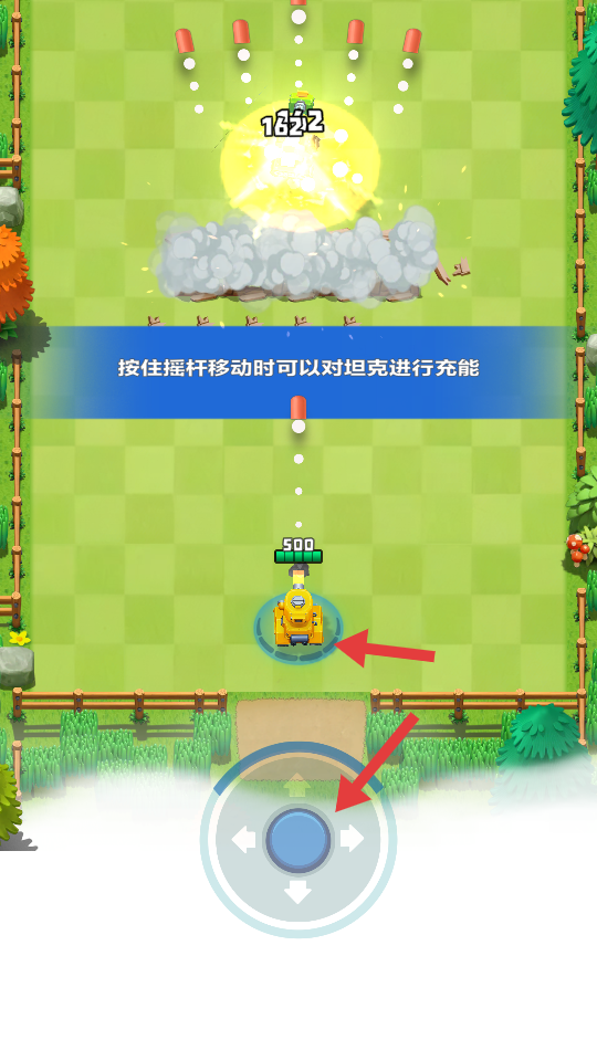 2、按住搖桿移動坦克時,可以對坦克充能,充能后釋放能造成大范圍爆炸傷害,遇到敵人密集區(qū)域,可利用充能攻擊高效清敵。