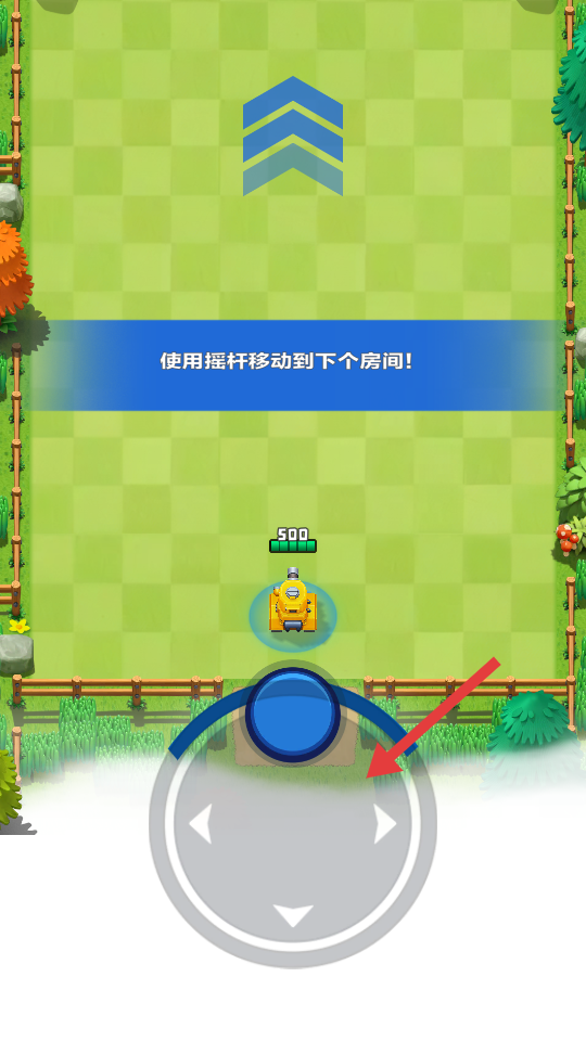 1、游戲開始操控下方搖桿,讓坦克朝著上方箭頭指示方向移動,前往下一個房間,開啟地牢探索之旅。