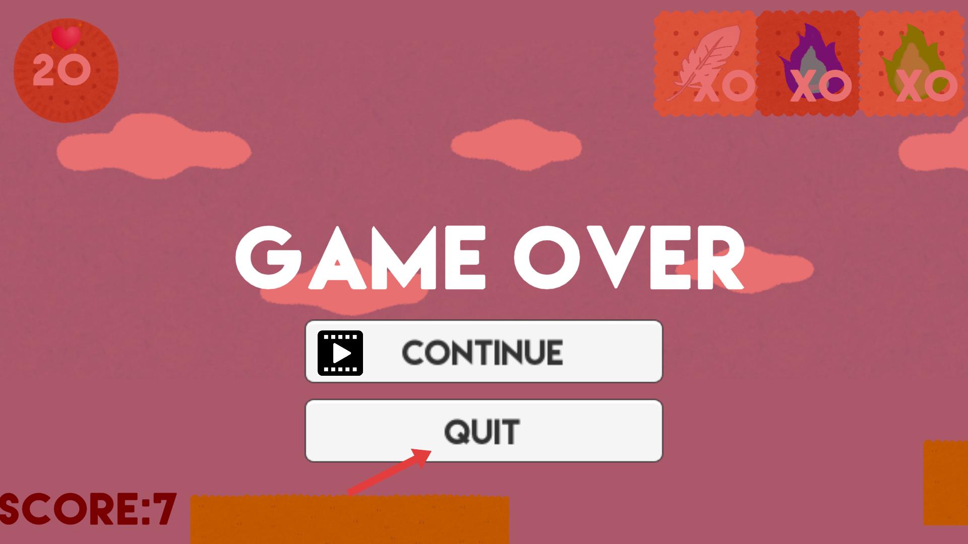 3、當游戲結束出現(xiàn)GAME OVER界面時,若不想繼續(xù),點擊QUIT按鈕,退出當前游戲進程。