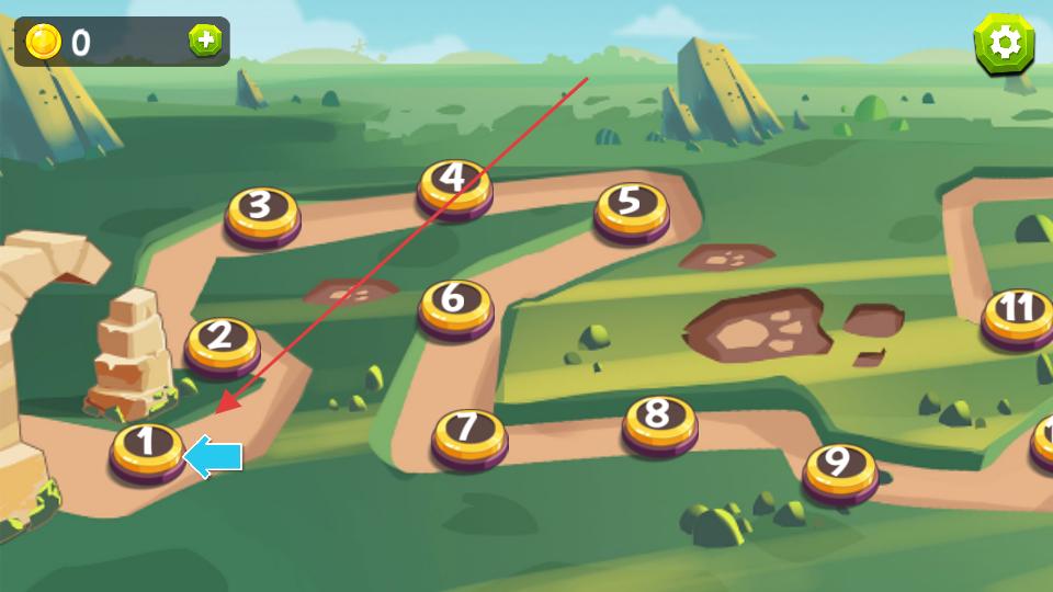 1、進(jìn)入游戲先看到關(guān)卡選擇界面,上面有標(biāo)著數(shù)字的圓形關(guān)卡按鈕,點(diǎn)擊標(biāo)著1的按鈕,就能進(jìn)入第一關(guān)開始冒險(xiǎn)。