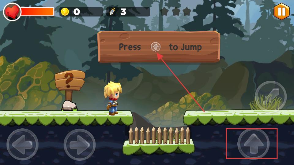 3、遇到需要跳躍的障礙時(shí),點(diǎn)擊屏幕下方的向上箭頭按鈕,角色就會(huì)跳躍起來,越過障礙繼續(xù)前行。