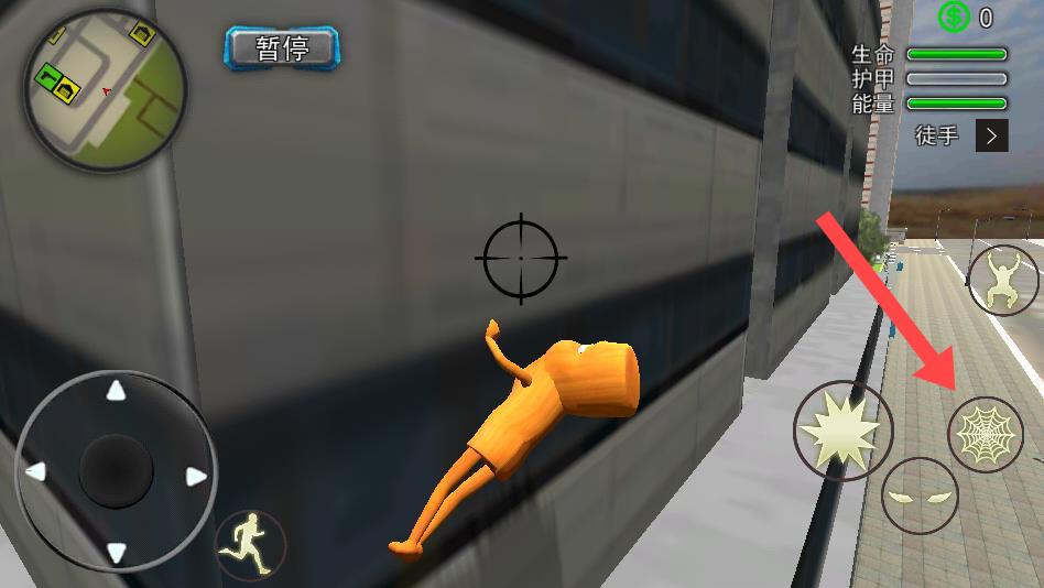 4、角色在建筑旁,按需點(diǎn)右側(cè)技能,如蛛網(wǎng),輔助完成場景互動(dòng),推進(jìn)任務(wù)。