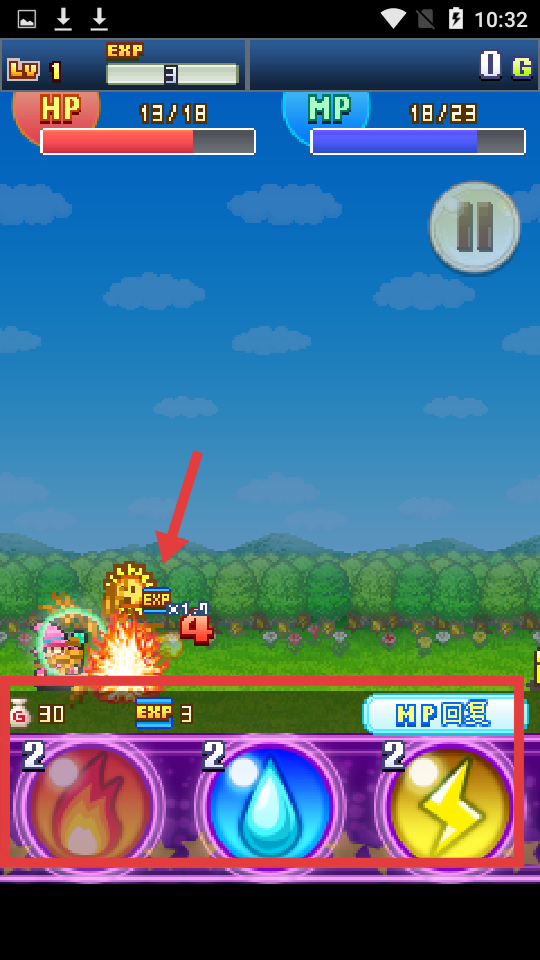 3、戰(zhàn)斗時(shí)下方有火焰、水滴、閃電等技能圖標(biāo),點(diǎn)擊釋放對(duì)應(yīng)魔法攻擊敵人,同時(shí)注意HP和MP變化,適時(shí)使用HP回復(fù)等功能維持狀態(tài)。