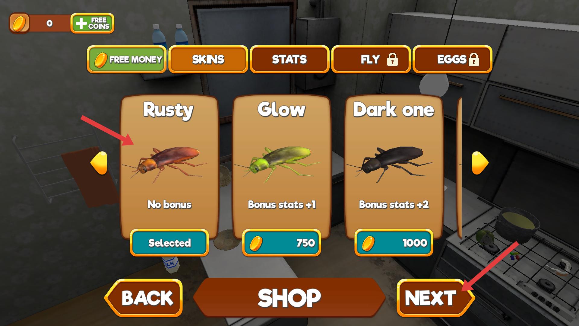 1、游戲開(kāi)始可選擇蟑螂種類(lèi),不同種類(lèi)有不同加成,選已解鎖的Rusty,選好后點(diǎn)擊NEXT進(jìn)入下一步。