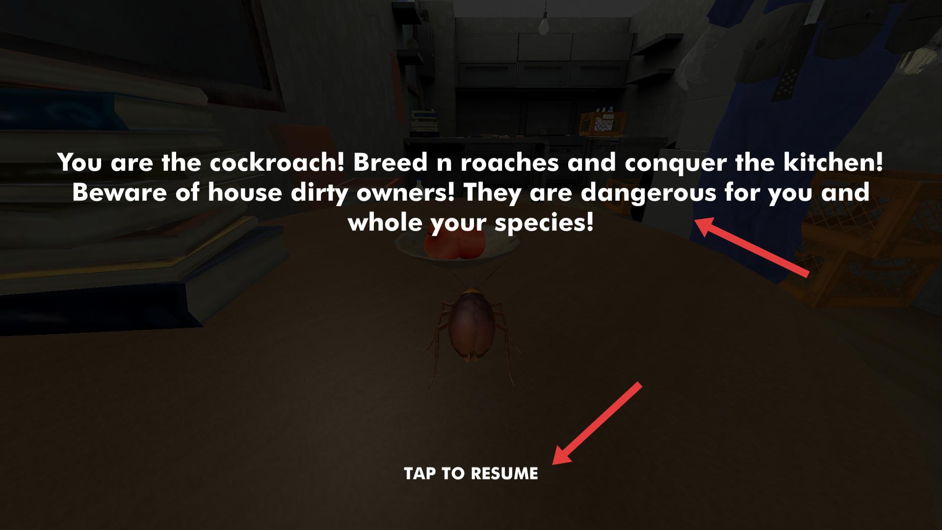 3、進(jìn)入游戲前會(huì)提示你是蟑螂,要繁殖并占領(lǐng)廚房,還得小心房主,他們對(duì)蟑螂有威脅,點(diǎn)擊箭頭所指按鈕開(kāi)始游戲。