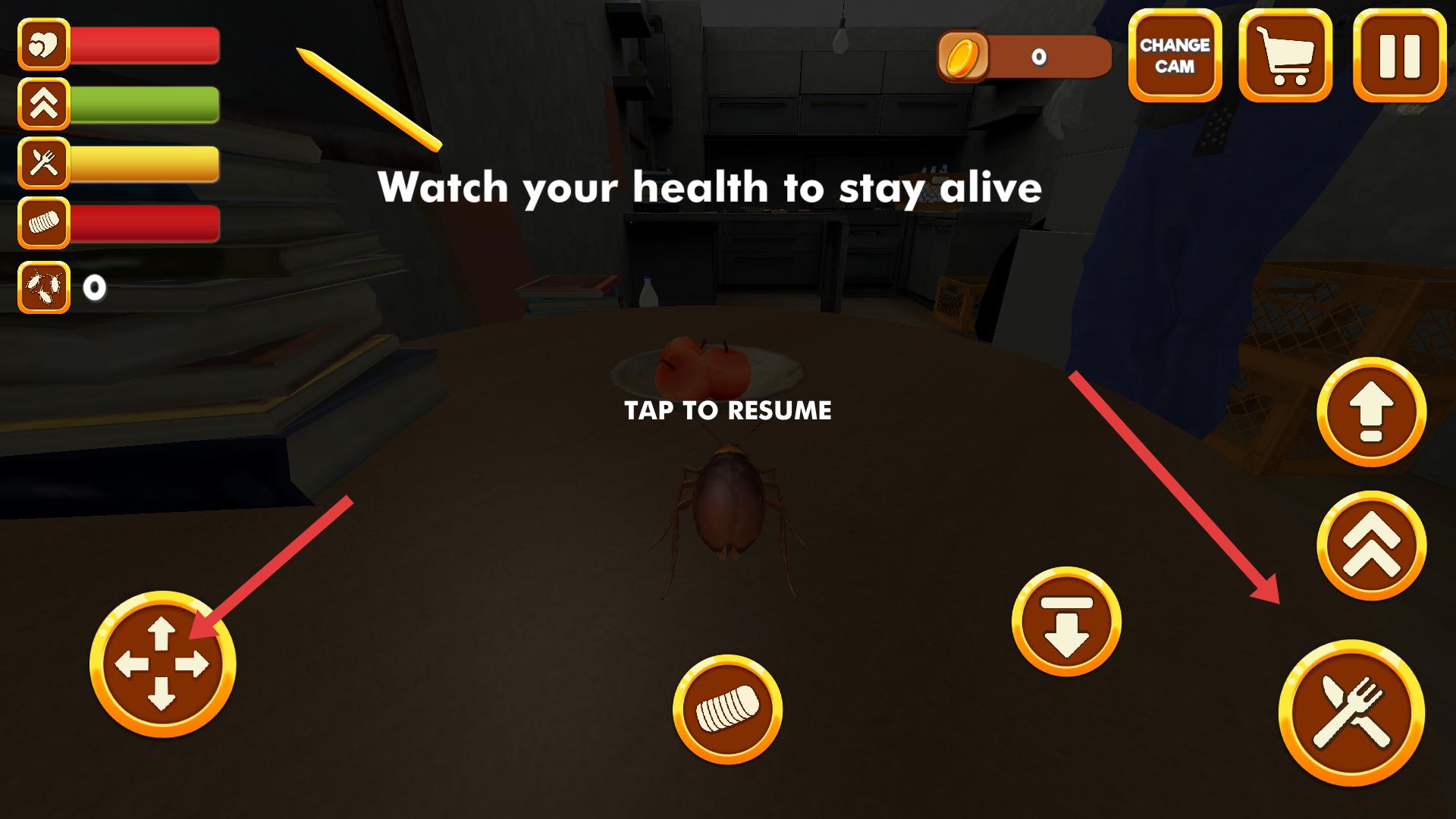 4、游戲中要關(guān)注健康值,利用左側(cè)方向鍵控制蟑螂移動(dòng),右側(cè)按鈕可進(jìn)行相關(guān)操作,確保蟑螂存活并完成繁殖任務(wù)。