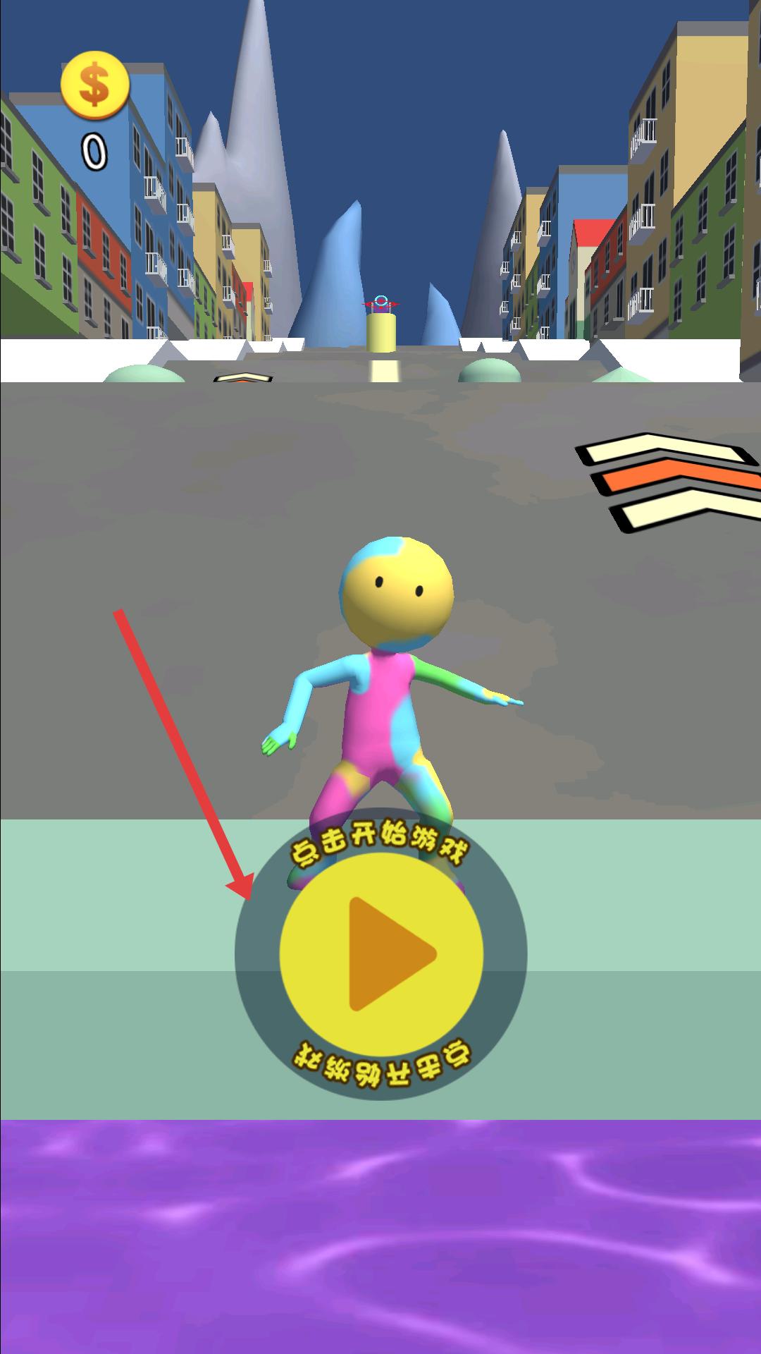 1、進(jìn)入游戲,界面有點(diǎn)擊開始游戲按鈕,點(diǎn)擊它即可開啟跑酷,操控彩色小人在城市道路上奔跑。