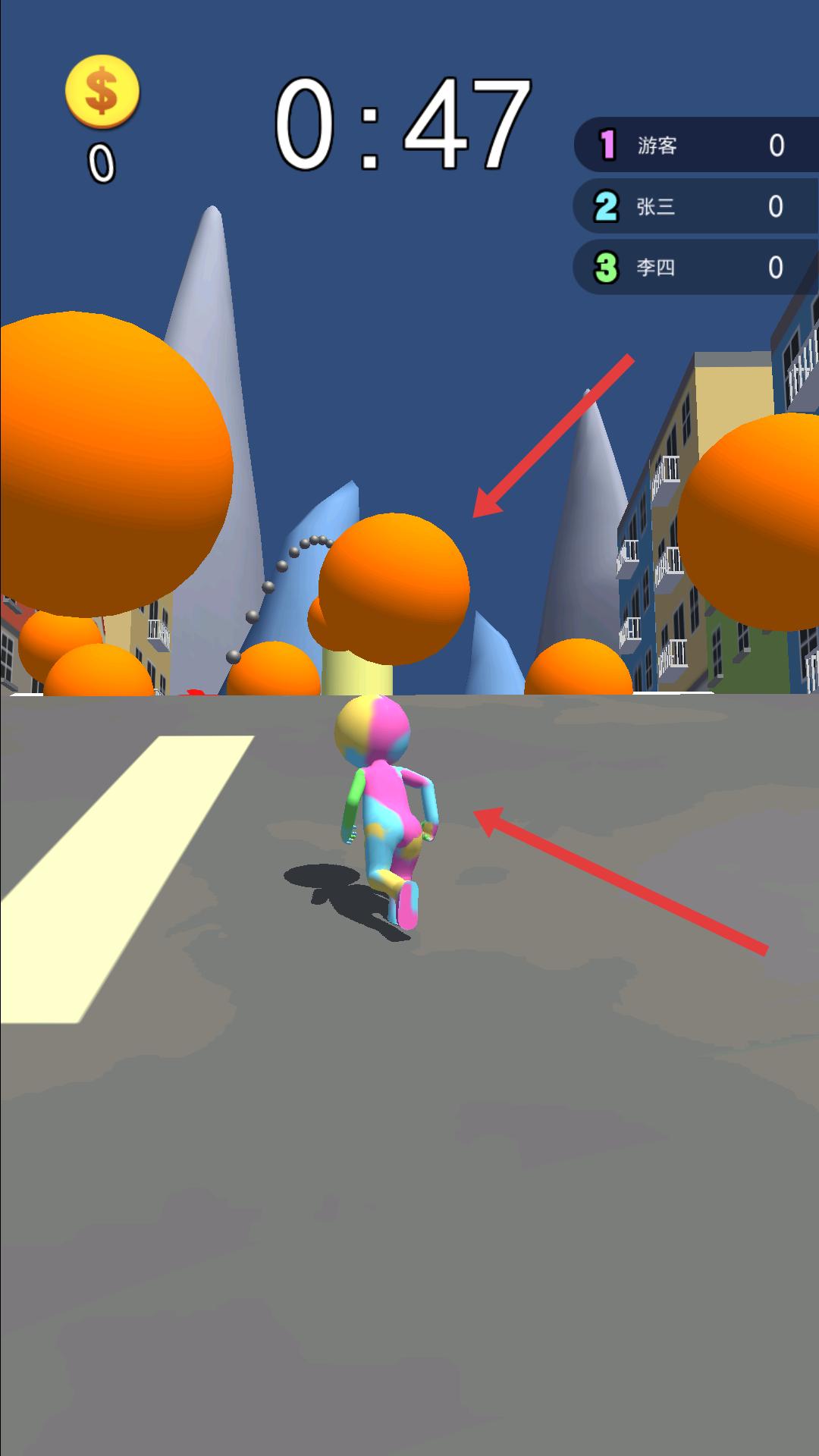 2、游戲中彩色小人需躲避橙色大球等障礙物,同時(shí)盡可能收集金幣,提升自己的分?jǐn)?shù),爭取好排名。