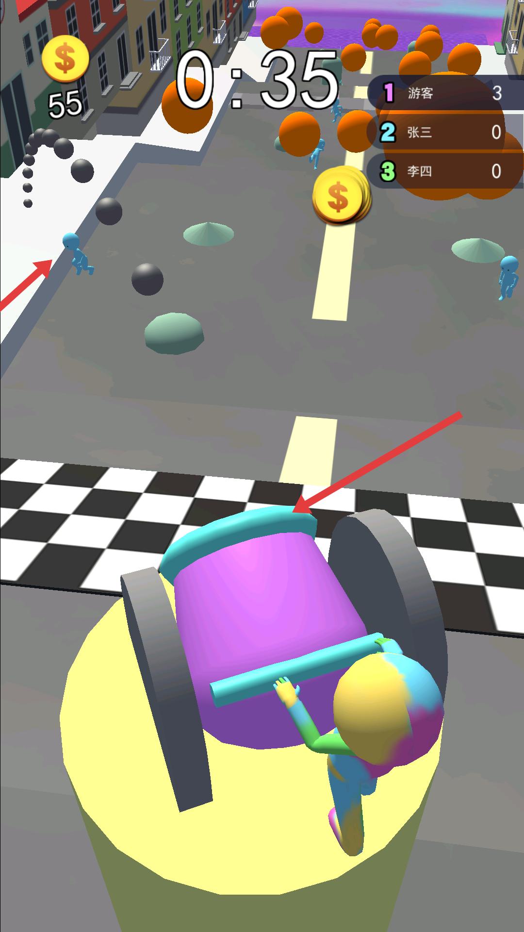 3、奔跑到達(dá)終點(diǎn)的玩家成為王者,可利用紫色大炮道具控制方向,淘汰其他小人,不讓其他玩家到達(dá)終點(diǎn)。