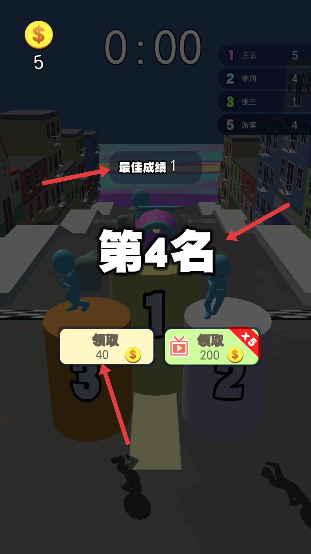 4、游戲結(jié)束后,會(huì)顯示排名,最佳成績等信息,可領(lǐng)取相應(yīng)金幣獎(jiǎng)勵(lì),之后能繼續(xù)挑戰(zhàn)新的跑酷。