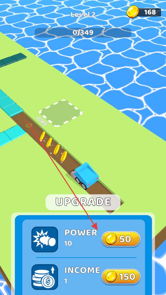 4、進(jìn)入Level2,看到UPGRADE界面,花費(fèi)50金幣提升小車POWER屬性,增強(qiáng)小車能力,更高效完成本關(guān)任務(wù)。