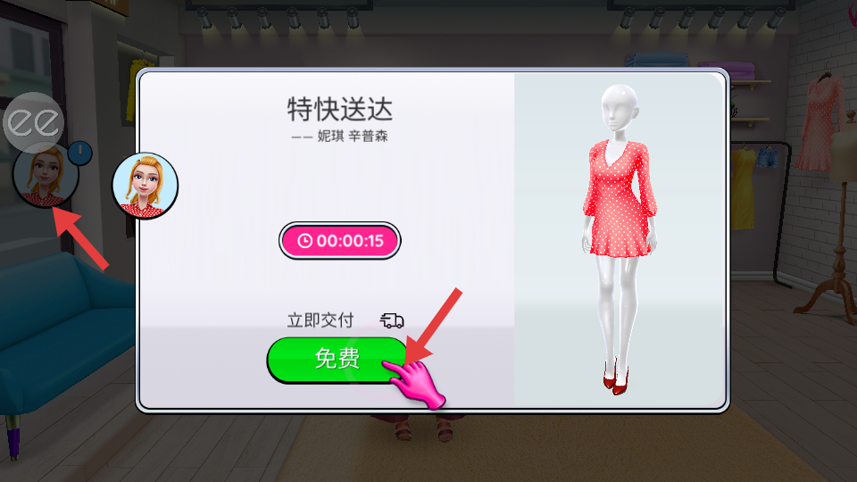 3、裝扮完成后會出現(xiàn)特快送達(dá)界面,可以點擊免費按鈕,選擇免費的送達(dá)方式,將搭配好的服裝送給客戶。
