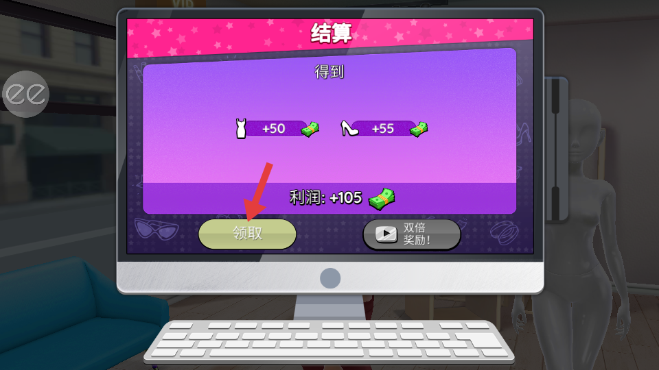 4、送達(dá)服裝后進(jìn)入結(jié)算界面,能看到獲得的獎勵和利潤,點擊領(lǐng)取按鈕,即可獲取相應(yīng)的金幣等獎勵,獎勵可以用于后續(xù)裝扮。