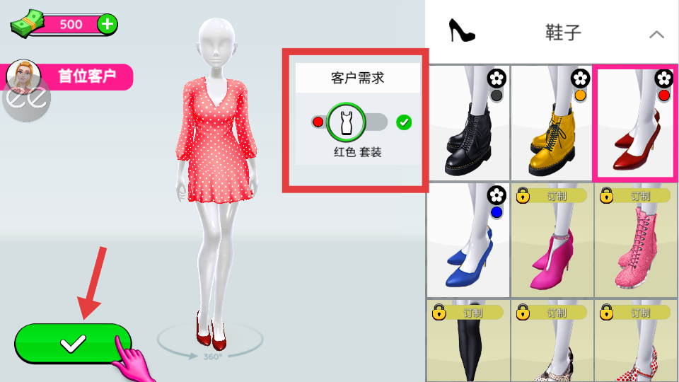 2、根據(jù)客戶需求比如要紅色套裝,從服裝目錄里選擇對應(yīng)的紅色裙子和紅色鞋子,搭配好后點擊綠色對勾按鈕確認(rèn)裝扮。