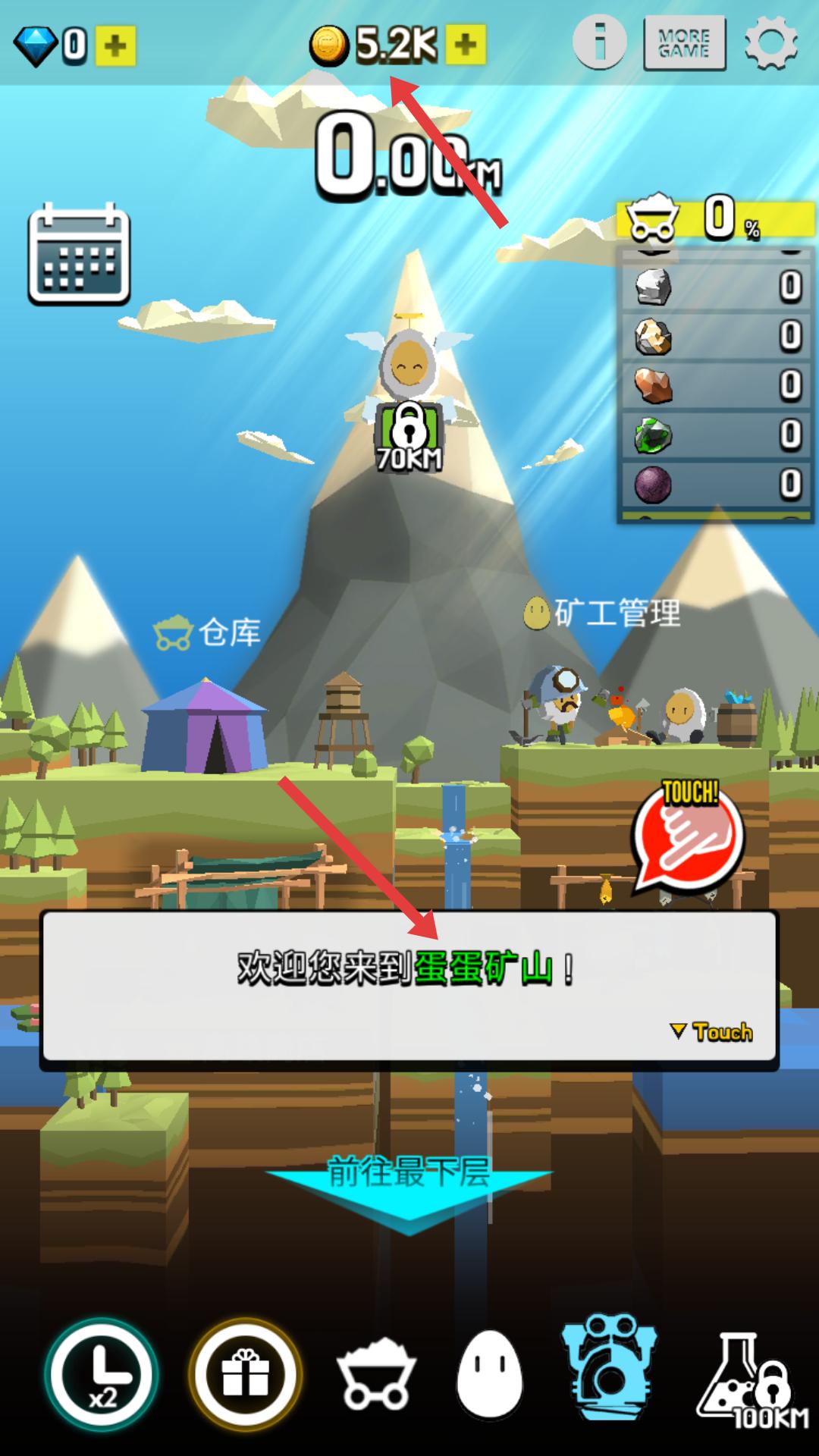1、進(jìn)入蛋蛋礦山開始挖掘,界面顯示初始金幣等信息,可先熟悉場景,為后續(xù)挖礦等操作做準(zhǔn)備。