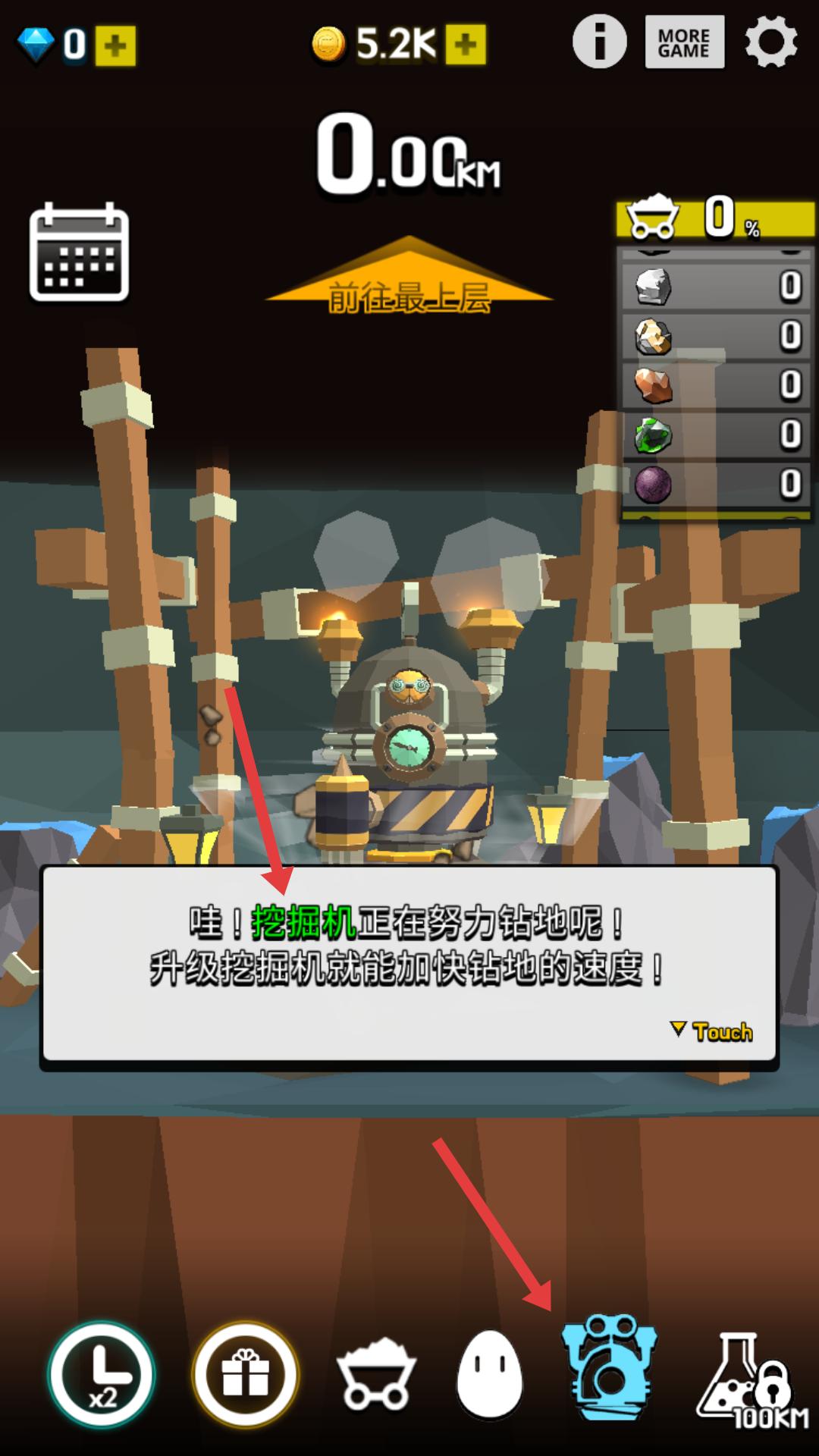 3、能看到挖掘機正在鉆地,升級挖掘機可加快鉆地速度,點擊下方相關(guān)圖標(biāo),可進(jìn)入升級界面。