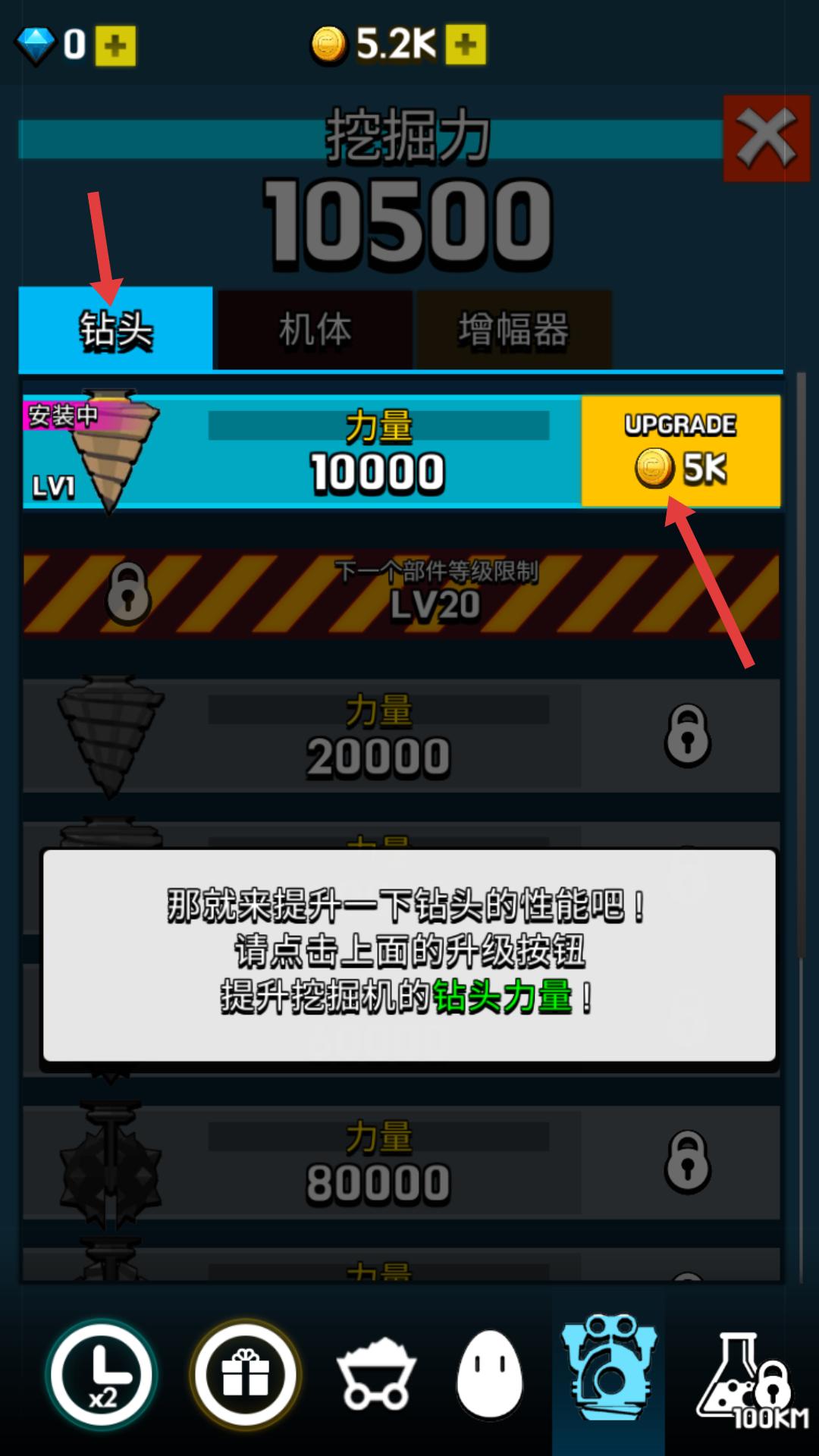 4、在挖掘機升級界面可提升鉆頭性能,點擊升級按鈕,消耗金幣就能增強鉆頭力量,提升挖掘效率。