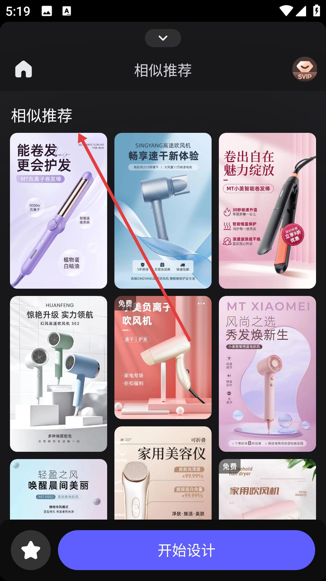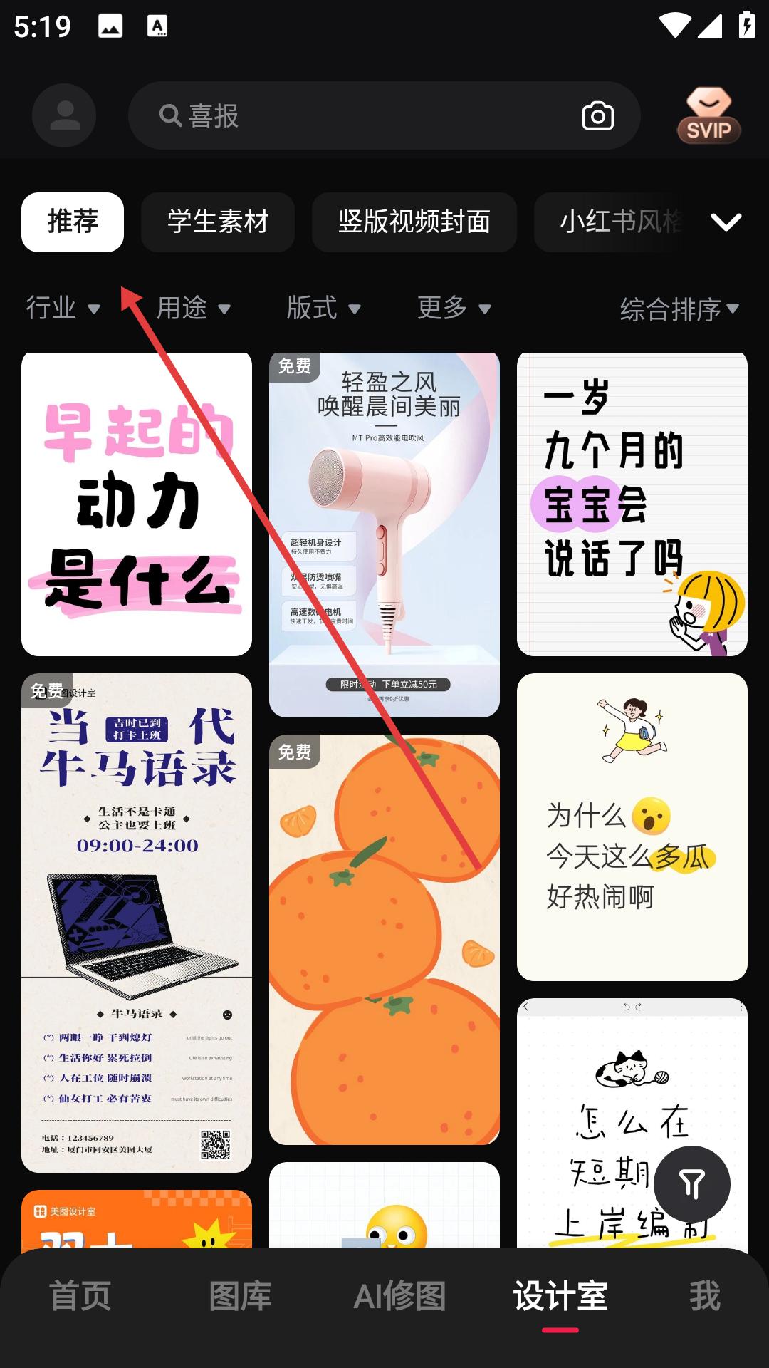 2、在素材分類區(qū)域,點擊推薦標(biāo)簽,瀏覽展示的各類模板,如關(guān)于早起動力、吹風(fēng)機(jī)宣傳等不同主題的模板。