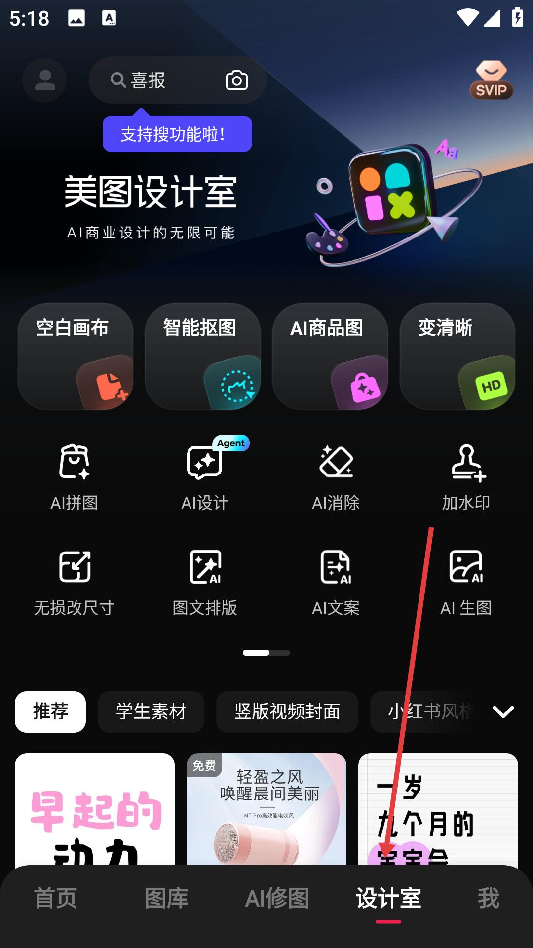 1、打開美圖秀秀,進(jìn)入設(shè)計室頁面,能看到空白畫布、智能摳圖等功能選項,還有推薦、學(xué)生素材等素材分類標(biāo)簽。