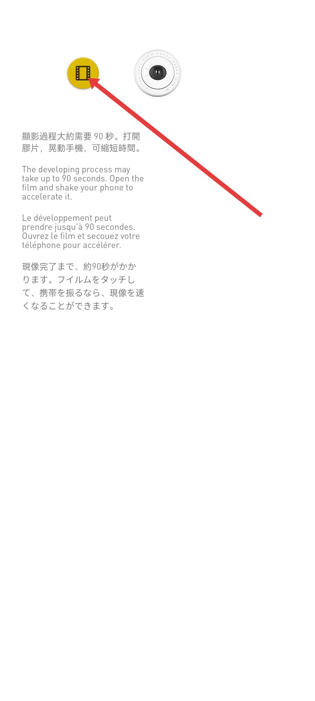 3、拍攝后顯影過(guò)程大約需要90秒,點(diǎn)擊黃膠片圖標(biāo),晃動(dòng)手機(jī)可縮短顯影時(shí)間,快速查看拍攝成果。