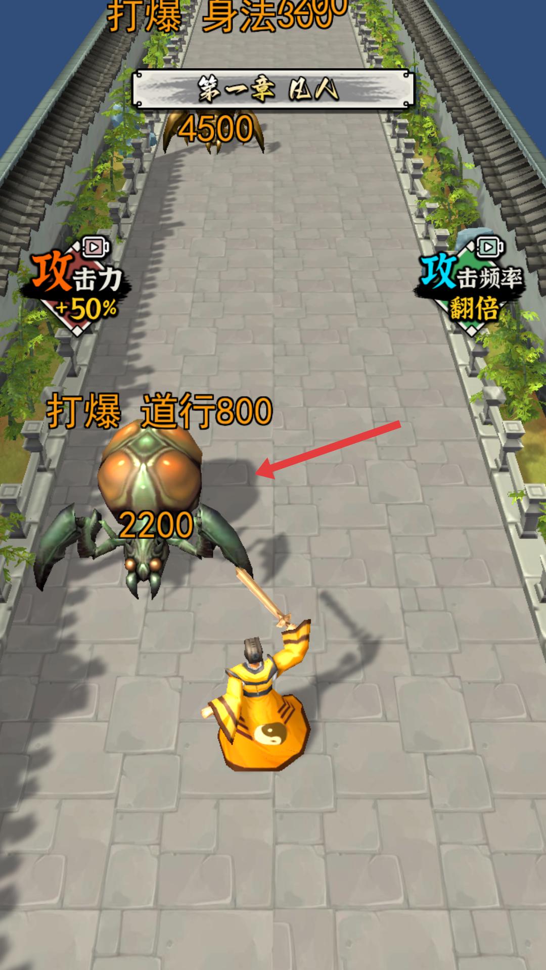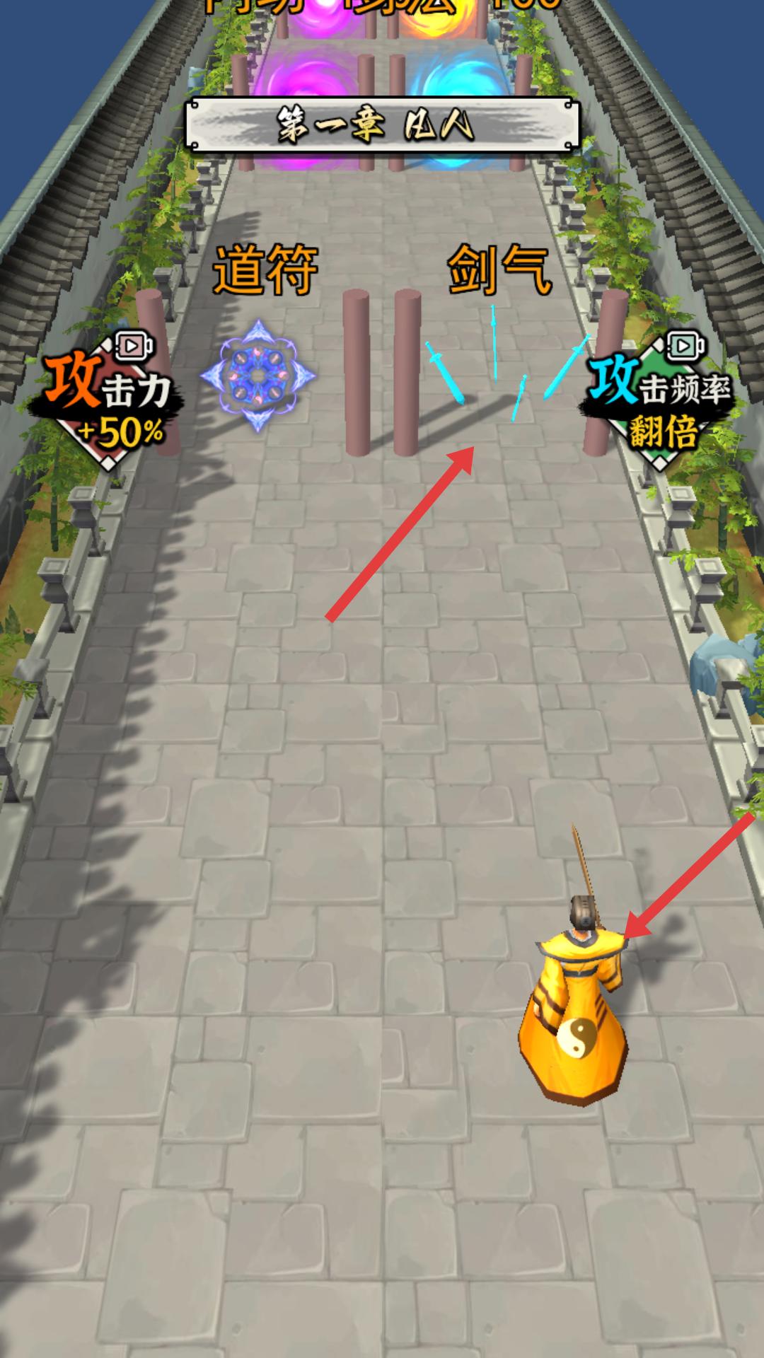 2、在第一章凡人階段,操控角色移動,優(yōu)先拾取道符、劍氣增益道具,提升攻擊力與攻擊頻率,助力戰(zhàn)斗。